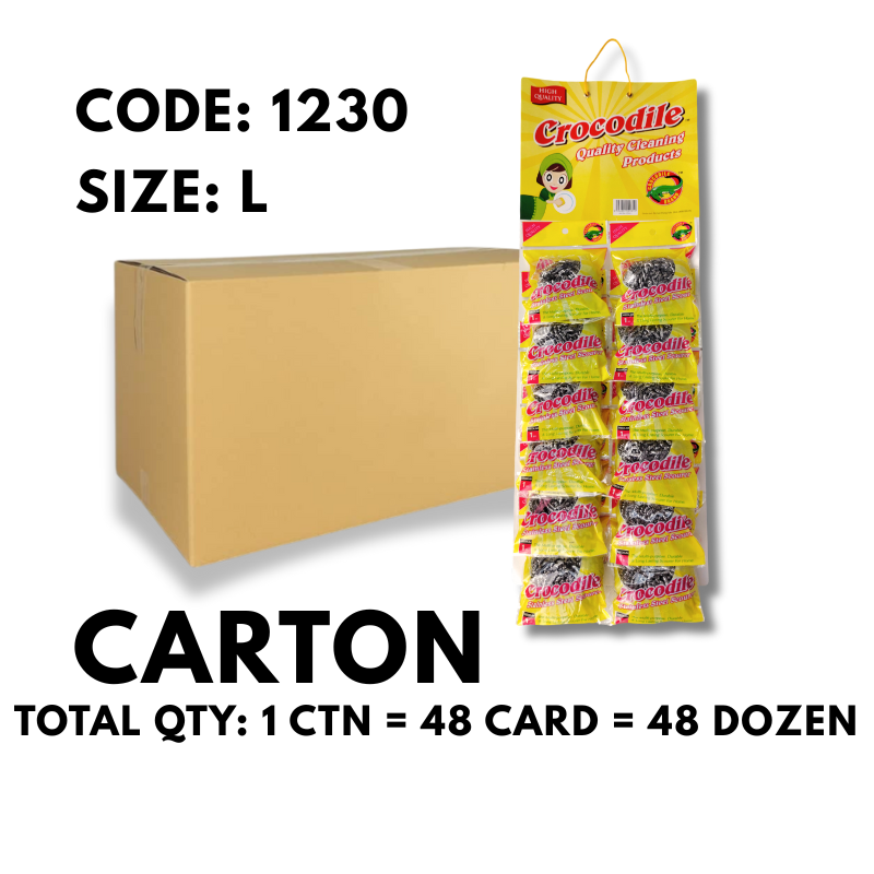 – 1 carton contains 488 cards (48 dozen) of 12pcs stainless steel scourer (Size L)